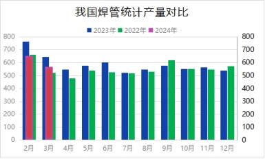 3月宏觀政策未超預期,鋼市呈現兩次弱勢探底行情;同時重要會議召開后北方連發兩周環保限產預警,部分架子管廠、鍍鋅管廠、鍍鋅加工廠等收到停產通知,放慢產能水平提升節奏。國家統計局統計數據顯示,2024年3月份,我國焊接無縫鋼管產量567.3萬噸,同比下降3.5%;1-3月份我國焊接無縫鋼管產量1192.5萬噸,同比下降5.6%。