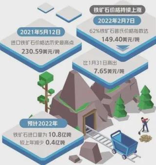 中國鐵礦石價格指數(shù)監(jiān)測顯示,62%鐵礦石直進月均價已從2021年11月94.57美元/噸,升至2022年2月均價148.27美元/噸,2022年2月10日單日價格達到152.46美元/噸。