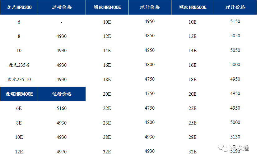 2、盤(pán)螺平穩(wěn):HRB400EΦ8-10mm盤(pán)螺指導(dǎo)價(jià)格為4940元,6mm加價(jià)500元/噸;