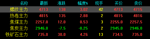今日螺紋主力期貨漲138,收報(bào)4713,漲幅3.02%;熱卷主力漲135,收報(bào)4815,漲幅2.88%;焦煤主力漲12,收報(bào)2257,漲幅0.53%;焦炭主力跌7.5,收報(bào)2946,跌幅0.25%;鐵礦石主力漲30收報(bào)735,漲幅4.26%。