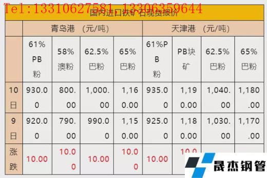 2月10日,青島港鐵礦石現(xiàn)貨價(jià)格普遍上漲,61%PB粉礦上漲10收930元/噸,58%澳粉上漲10收800元/噸,62.5%巴粉上漲10收1000元/噸,65%巴粉上漲10收1160元/噸;天津港鐵礦石現(xiàn)貨價(jià)格也普遍上漲,61%PB粉礦上漲10收935元/噸,PB塊礦上漲10收1190元/噸,62.5%巴粉上漲10收1040元/噸,65%巴粉上漲10收1180元/噸。