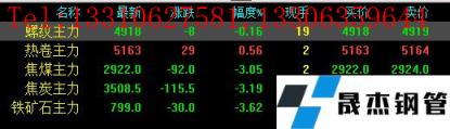 今日螺紋主力期貨跌8,收報4918,跌幅0.16%;熱卷主力漲29,收報5163,漲幅0.56%;焦煤主力跌92,收報2922,跌3.05%;焦炭主力跌115.5,收報3508.5,跌幅3.19%;鐵礦石主力跌30,收報799,跌幅3.62%。