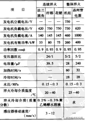 數據表明,感應回火的疲勞壽命較爐中回火為高。其原因是,感應快速加熱時,最表層首先瞬時產生馬氏體分解,使體積收縮處于相變超塑性階段,待整體回火完成后表層形成更大的壓應力,具有一個更理想的有利于提高疲勞強度的應力分布;而爐內加熱緩慢沒有這種條件。(3)半軸感應加熱表面淬火舉例,40MnB鋼制造的帶法蘭半軸的表面淬火工藝技術要求見表8 ,其淬火工藝可以采用連續加熱淬火和整體一次加熱淬火,工藝參數見表9 和表10 。▼表840MnB鋼半軸表面感應淬火技術要求