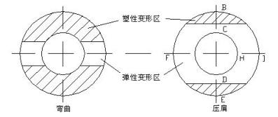 橫向壓扁及通過疊加橢圓壓扁變形來達(dá)到矯直的目的。在矯直截面中產(chǎn)生如圖8-9中BCDE的塑性區(qū)。這對(duì)矯直效果是非常重要的,因?yàn)閺澢C直不能使截面全部為塑性區(qū),利用壓扁變形來補(bǔ)償。另外,對(duì)局部彎曲、管端彎曲、縱向彎曲矯直效果很差,必須是縱向彎曲和壓扁的共同作用才能達(dá)到滿意的矯直效果。(注:提高厚壁鋼管壁厚精度可提高厚壁鋼管的抗壓