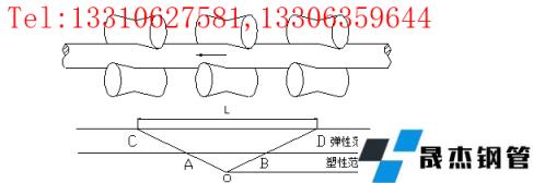縱向彎曲矯直是使厚壁鋼管產(chǎn)生與彎曲相反方向的塑性變形來達(dá)到矯直彎曲的目的,而不彎曲的管子斷面只產(chǎn)生彈性變形,塑性變形區(qū)占支撐距的40%長(zhǎng)度。