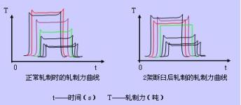 ④ 軋制力曲線臺階。例如:由于1架輥速過高、輥縫過大,2架輥速過低、輥縫過小而引起的變形制度不匹配,軋制力曲線異常(如下圖)。