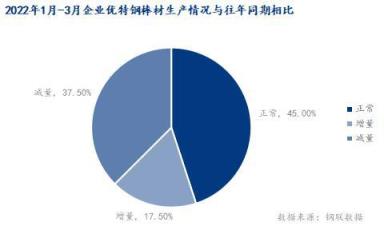 調研數據顯示,2022年1月-3月近45%樣本企業生產優特鋼棒材與往年持平,35%較往年有所減量。主要原因在于山東以北地區仍然處于冬季環保階段,部分無縫鋼管廠2月受冬奧會限產影響,產量也有所下降。