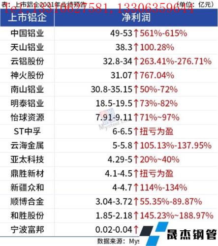 免責聲明:本網站(山東聊城晟杰無縫鋼管廠m.51pvc.cn)刊載的“15家上市鋁企2021年業績飄紅,神火股份大增超7倍”等均源于網絡,版權歸原作者所有,且僅代表原作者觀點,本文所載信息僅供參考。轉載僅為學習與交流之目的,如無意中侵犯您的合法權益,請及時聯系刪除。本網站刊登此篇文章并不意味著本站贊同其觀點或證實其內容的真實性,我們不對其科學性、嚴肅性等作任何形式的保證。如果侵犯了您的版權,請盡快聯系我們予以撤銷,謝謝合作!