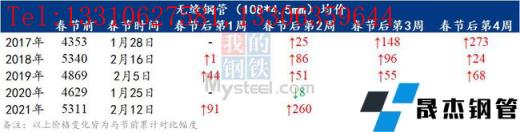 小編匯總近5年春節(jié)后四周無縫厚壁鋼管均價(jià)變化情況,以供參考。