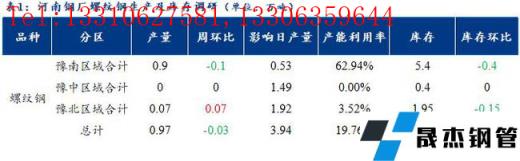 1、調(diào)研數(shù)據(jù)顯示,統(tǒng)計(jì)的河南地區(qū)10家建筑厚壁無(wú)縫鋼管樣本無(wú)縫厚壁鋼管廠(chǎng)家中,河南省建材無(wú)縫厚壁鋼管廠(chǎng)家螺紋鋼日產(chǎn)量0.97萬(wàn)噸;檢修/限產(chǎn)影響建材日產(chǎn)量為3.94萬(wàn)噸,產(chǎn)能利用率為19.76%,較上周下降0.61%。