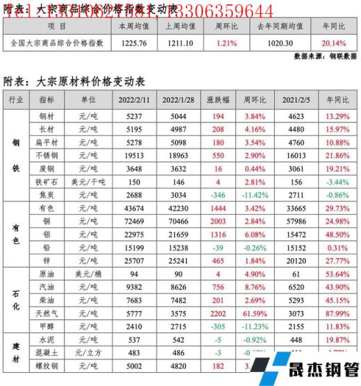 免責(zé)聲明:本網(wǎng)站(山東聊城晟杰無(wú)縫鋼管廠m.51pvc.cn)刊載的“MRI:大宗原材料價(jià)格周報(bào)(2月7日-2月11日)”等均源于網(wǎng)絡(luò),版權(quán)歸原作者所有,且僅代表原作者觀點(diǎn),本文所載信息僅供參考。轉(zhuǎn)載僅為學(xué)習(xí)與交流之目的,如無(wú)意中侵犯您的合法權(quán)益,請(qǐng)及時(shí)聯(lián)系刪除。本網(wǎng)站刊登此篇文章并不意味著本站贊同其觀點(diǎn)或證實(shí)其內(nèi)容的真實(shí)性,我們不對(duì)其科學(xué)性、嚴(yán)肅性等作任何形式的保證。如果侵犯了您的版權(quán),請(qǐng)盡快聯(lián)系我們予以撤銷(xiāo),謝謝合作!