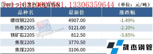 截至3月9日收盤,螺紋鋼2205收4907元/噸,跌1.49%;熱卷2205收5121元/噸,跌2.2%;鐵礦石2205收812.5元/噸,跌3.85%。