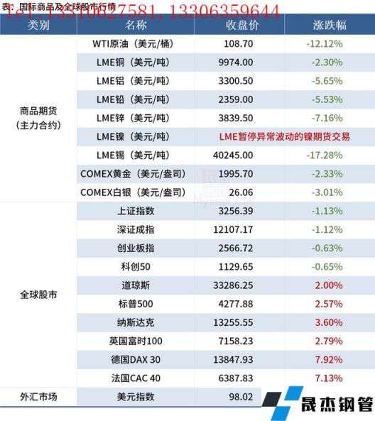 免責聲明:本網站(山東聊城晟杰無縫鋼管廠m.51pvc.cn)刊載的“2022年03月10日早讀:黑色系夜盤全線下挫,國際油價大跌超12%”等均源于網絡,版權歸原作者所有,且僅代表原作者觀點,本文所載信息僅供參考。轉載僅為學習與交流之目的,如無意中侵犯您的合法權益,請及時聯系刪除。本網站刊登此篇文章并不意味著本站贊同其觀點或證實其內容的真實性,我們不對其科學性、嚴肅性等作任何形式的保證。如果侵犯了您的版權,請盡快聯系我們予以撤銷,謝謝合作!