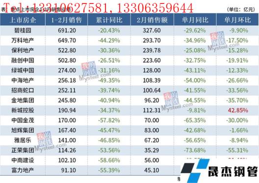 免責聲明:本網站(山東聊城晟杰無縫鋼管廠m.51pvc.cn)刊載的“15家重點房企2月銷售同比降幅擴大,房地產下行壓力持續”等均源于網絡,版權歸原作者所有,且僅代表原作者觀點,本文所載信息僅供參考。轉載僅為學習與交流之目的,如無意中侵犯您的合法權益,請及時聯系刪除。本網站刊登此篇文章并不意味著本站贊同其觀點或證實其內容的真實性,我們不對其科學性、嚴肅性等作任何形式的保證。如果侵犯了您的版權,請盡快聯系我們予以撤銷,謝謝合作!