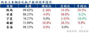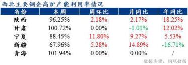 本周對(duì)西北區(qū)域15家建筑厚壁無(wú)縫鋼管生產(chǎn)企業(yè)同口徑調(diào)查顯示,目前西北區(qū)域15家鋼鐵生產(chǎn)企業(yè)38座高爐實(shí)際開(kāi)工高爐37座,新疆區(qū)域新增4座高爐復(fù)產(chǎn),高爐開(kāi)工率為67.96%,周環(huán)比提升5.28%;高爐實(shí)際產(chǎn)量71.2萬(wàn)噸,周環(huán)比增加7.28萬(wàn)噸;高爐產(chǎn)能利用率85.88%,周環(huán)比提高8.78%。