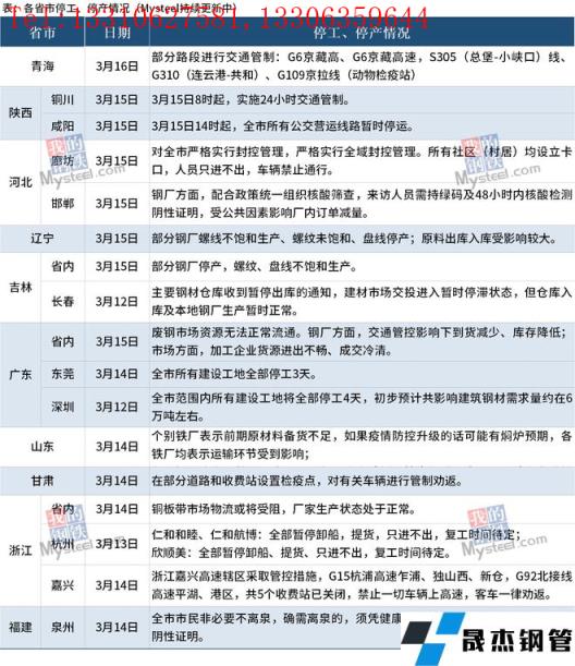 截至3月16日,匯總了10個省份最新停工停產信息。其中,河北省于3月15日宣布,除張家口、承德、秦皇島市按有關規定供暖時間外,其他法定3月15日停暖的地方供暖時間統一延長至3月31日24時。陜西省銅川市于15日宣布全市范圍內實施24小時交通管制;咸陽市15日宣布全市所有公交營運路線暫時停運。吉林省部分無縫厚壁鋼管廠家停產,螺紋、盤線不飽和生產。與此同時,全國其他地區鋼貿交易也受到影響,部分工地開始停工,物流運輸暫停服務。具體情況如下: