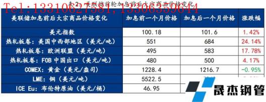 那么,在美聯儲歷史上進行加息的時間區間中,大宗商品價格都是如何變化的呢?選取了美聯儲第六輪加息期間(2016.12-2018.12)美元指數、熱軋板卷、黃金、銅、布倫特原油作為參考標的進行分析,其中參考時間維度為2016年加息落地前一個月的交易日價格與加息落地后一個月的交易日價格(表2)。