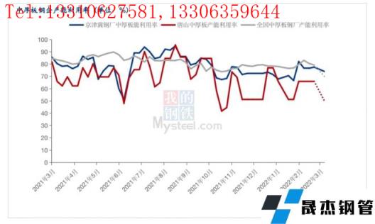 由于前期京津冀地區(qū)受到“2+26”座城市秋冬季限產(chǎn)、冬殘奧會(huì)限產(chǎn)等政策,產(chǎn)能利用率出現(xiàn)了明顯的下滑。隨著采暖季的結(jié)束以及東殘奧會(huì)的閉幕,鋼企的產(chǎn)能利用率出現(xiàn)了回升,截至3月18日,全國中厚板鋼企產(chǎn)能利用率79.13%,京津冀地區(qū)中厚板鋼企產(chǎn)能利用率77.55%,唐山地區(qū)中厚板鋼企產(chǎn)能利用率為65.53%,隨著3月19日唐山疫情突發(fā),無縫厚壁鋼管廠家的復(fù)產(chǎn)節(jié)奏與物流均受到了影響,當(dāng)下原料供給是當(dāng)下比較棘手的問題,短期內(nèi)爐料補(bǔ)給不足,鋼企被迫停產(chǎn)的可能性較大。預(yù)計(jì)3月底,唐山中厚板產(chǎn)能利用率或?qū)⒋蠓陆?,全國中厚板鋼企產(chǎn)能利用率預(yù)計(jì)在70%左右。