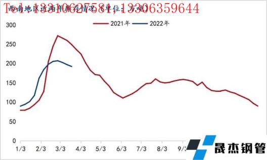 三月份西南地區(qū)建筑厚壁無縫鋼管窄幅震蕩運行,下游復工復產不及預期、全國疫情再次擴散、俄烏局勢沖突未息等多重因素疊加,放緩了季節(jié)性需求釋放的速度,西南整體去庫存速度同比偏緩慢。筆者就西南地區(qū)庫存數(shù)據情況作簡要分析。