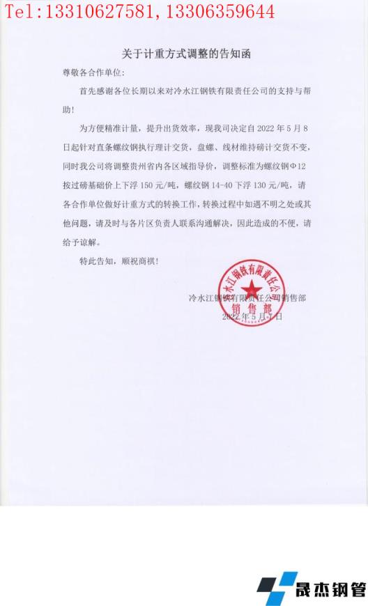 免責聲明:本網站(山東聊城晟杰無縫鋼管廠m.51pvc.cn)刊載的“冷水江鋼鐵有限責任公司關于對貴州區域計重方式調整的告知函”等均源于網絡,版權歸原作者所有,且僅代表原作者觀點,本文所載信息僅供參考。轉載僅為學習與交流之目的,如無意中侵犯您的合法權益,請及時聯系刪除。本網站刊登此篇文章并不意味著本站贊同其觀點或證實其內容的真實性,我們不對其科學性、嚴肅性等作任何形式的保證。如果侵犯了您的版權,請盡快聯系我們予以撤銷,謝謝合作!