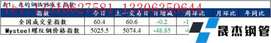 訊:全國(guó)建筑厚壁無(wú)縫鋼管成交量監(jiān)測(cè),成交量相對(duì)指數(shù)來(lái)看,全國(guó)60.4增0.2,北方41減1.9,華東86.9增0.9,南方45.5減0.3。今日螺紋鋼價(jià)格指數(shù)5025.5,較上一交易日減48.85。