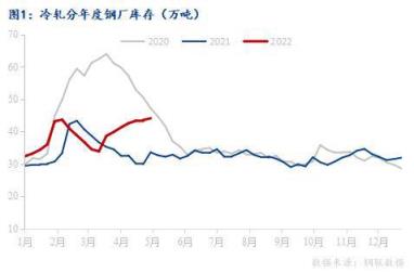 截止5月4日,監測的26個城市庫存,冷軋板卷社會庫存為139.41萬噸。社會庫存雖未到達年內的峰值,但也同樣處于相對高位。年同比增加19.97萬噸,同比數據同樣驚人。主要是汽車、家電等制造業,在疫情下產量紛紛出現下滑,終端用鋼量明顯縮量。但短期局部區域物流受疫情防控影響,廠庫無法向社庫端去進行轉移,因此社庫的累積速度并不及廠庫。