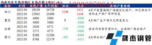 4、貴州地區4月電弧爐無縫厚壁鋼管廠家日均建筑厚壁無縫鋼管產量為8286噸,環比減少482噸,降幅5.50%;同比減少4000噸,降幅32.56%。4月檢查組進駐貴州,貴州地區開展安全大檢查,部分電弧爐無縫厚壁鋼管廠家生產受到影響,加之建材價格低洼,廢鋼價格堅挺,無縫厚壁鋼管廠家延續虧損,停產檢修較多,產量環比小幅下降。