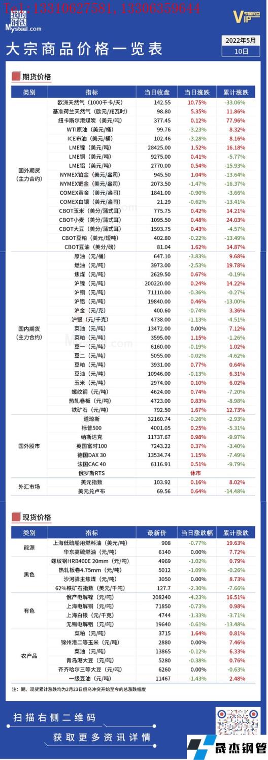 免責聲明:本網站(山東聊城晟杰無縫鋼管廠m.51pvc.cn)刊載的“俄烏局勢丨大宗商品價格一覽表(5月10日)”等均源于網絡,版權歸原作者所有,且僅代表原作者觀點,本文所載信息僅供參考。轉載僅為學習與交流之目的,如無意中侵犯您的合法權益,請及時聯系刪除。本網站刊登此篇文章并不意味著本站贊同其觀點或證實其內容的真實性,我們不對其科學性、嚴肅性等作任何形式的保證。如果侵犯了您的版權,請盡快聯系我們予以撤銷,謝謝合作!