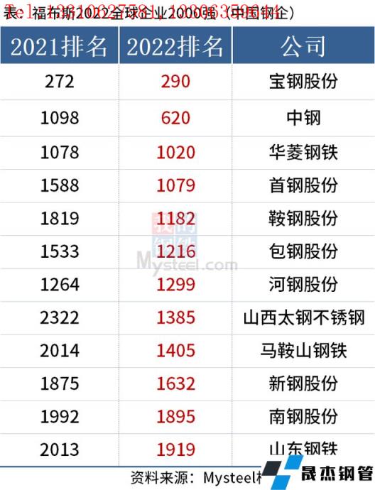 免責聲明:本網站(山東聊城晟杰無縫鋼管廠m.51pvc.cn)刊載的“中國12家鋼企上榜福布斯2022全球企業2000強”等均源于網絡,版權歸原作者所有,且僅代表原作者觀點,本文所載信息僅供參考。轉載僅為學習與交流之目的,如無意中侵犯您的合法權益,請及時聯系刪除。本網站刊登此篇文章并不意味著本站贊同其觀點或證實其內容的真實性,我們不對其科學性、嚴肅性等作任何形式的保證。如果侵犯了您的版權,請盡快聯系我們予以撤銷,謝謝合作!