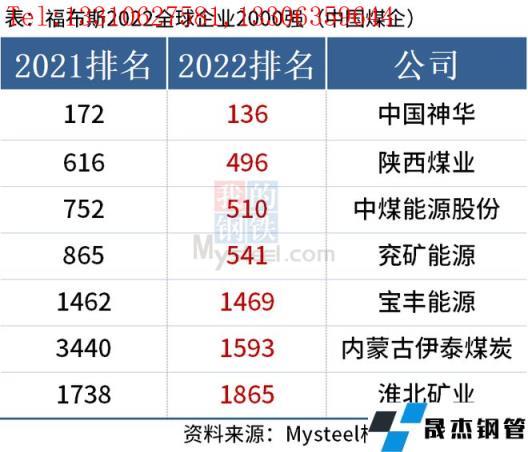 免責聲明:本網站(山東聊城晟杰無縫鋼管廠m.51pvc.cn)刊載的“中國7家煤企上榜福布斯2022全球企業2000強”等均源于網絡,版權歸原作者所有,且僅代表原作者觀點,本文所載信息僅供參考。轉載僅為學習與交流之目的,如無意中侵犯您的合法權益,請及時聯系刪除。本網站刊登此篇文章并不意味著本站贊同其觀點或證實其內容的真實性,我們不對其科學性、嚴肅性等作任何形式的保證。如果侵犯了您的版權,請盡快聯系我們予以撤銷,謝謝合作!