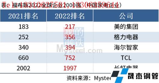 免責聲明:本網站(山東聊城晟杰無縫鋼管廠m.51pvc.cn)刊載的“中國5家家電企業上榜福布斯2022全球企業2000強”等均源于網絡,版權歸原作者所有,且僅代表原作者觀點,本文所載信息僅供參考。轉載僅為學習與交流之目的,如無意中侵犯您的合法權益,請及時聯系刪除。本網站刊登此篇文章并不意味著本站贊同其觀點或證實其內容的真實性,我們不對其科學性、嚴肅性等作任何形式的保證。如果侵犯了您的版權,請盡快聯系我們予以撤銷,謝謝合作!