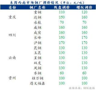 本周四川省部分城市放寬購(gòu)房政策,重慶將迎來(lái)汛期,云南推進(jìn)減產(chǎn)控產(chǎn)進(jìn)度,貴州推進(jìn)過(guò)磅改理計(jì); 本周鋼價(jià)持續(xù)弱勢(shì)運(yùn)行,無(wú)縫厚壁鋼管廠家利潤(rùn)明顯收縮,下游需求未有明顯改善,西南無(wú)縫厚壁鋼管廠家?guī)齑嬲w小幅增加。