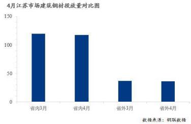 由上圖可見,4月江蘇省內無縫厚壁鋼管廠家在江蘇省13個城市投放建筑厚壁無縫鋼管量占總投放量的76.31%,省外無縫厚壁鋼管廠家占江蘇省總投放量的23.69%。同時,從調研數據來看,4月江蘇市場建筑厚壁無縫鋼管實際投放總量較3月減少4.36萬噸萬噸,降幅約2.76%。