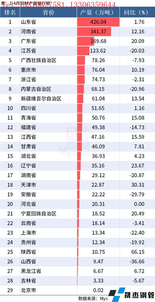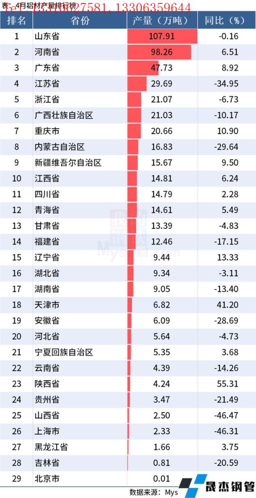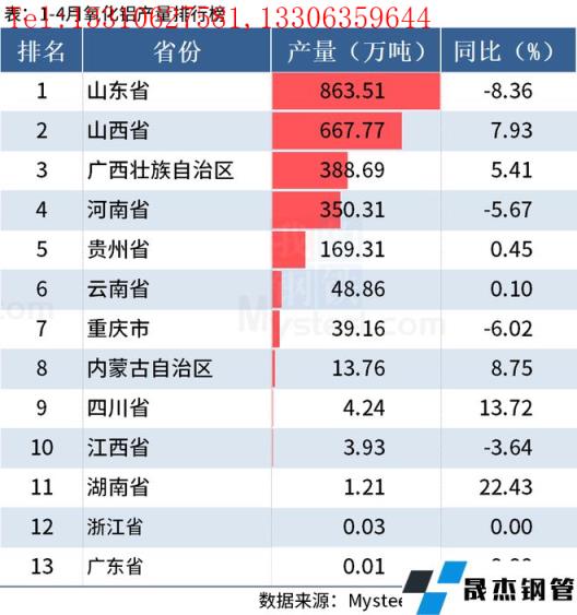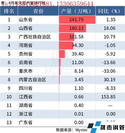 免責聲明:本網站(山東聊城晟杰無縫鋼管廠m.51pvc.cn)刊載的“統計局:前4月全國分省市鋁材、氧化鋁產量出爐”等均源于網絡,版權歸原作者所有,且僅代表原作者觀點,本文所載信息僅供參考。轉載僅為學習與交流之目的,如無意中侵犯您的合法權益,請及時聯系刪除。本網站刊登此篇文章并不意味著本站贊同其觀點或證實其內容的真實性,我們不對其科學性、嚴肅性等作任何形式的保證。如果侵犯了您的版權,請盡快聯系我們予以撤銷,謝謝合作!