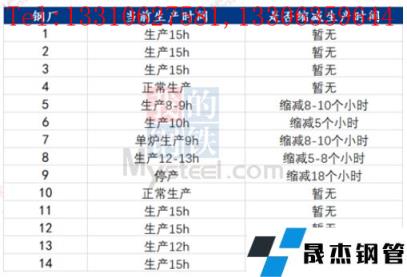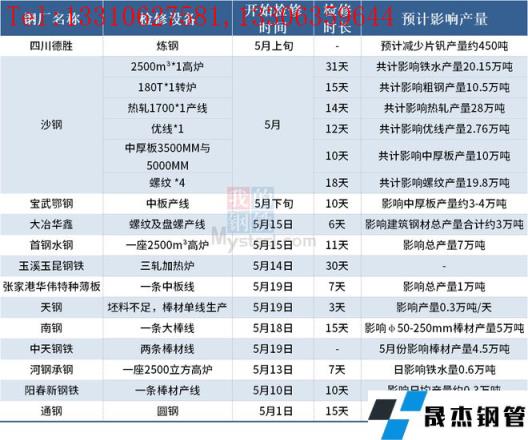 據不完全統計,截至5月20日,國內13家無縫厚壁鋼管廠家發布檢修計劃。其中,中天鋼鐵因一座轉爐檢修,坯料不足,兩條棒材線停產檢修,預計5月份影響棒材產量4.5萬噸。