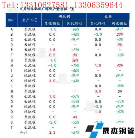 據(jù)4月底的調研,5月東北無縫厚壁鋼管廠家螺紋和盤線的計劃產(chǎn)量分別為119.5萬噸和95.9萬噸,同比減少57.1萬噸和26.3萬噸,環(huán)比增加10.5萬噸和12.3萬噸;受市場價格下行影響,無縫厚壁鋼管廠家虧損幅度擴大,部分多品種生產(chǎn)的無縫厚壁鋼管廠家根據(jù)各品種的虧損幅度和訂單情況進行品種間的轉產(chǎn),單一生產(chǎn)螺線的無縫厚壁鋼管廠家部分復產(chǎn)、部分加大減產(chǎn),具體情況如下: