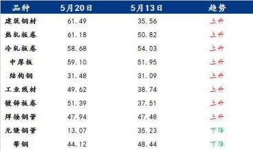 具體各品種指數(shù)來看,5月20日建筑厚壁無縫鋼管情緒指數(shù)為61.49,較5月13日回升25.93;熱軋板卷情緒指數(shù)為61.18,較5月13日回升10.36;冷軋板卷情緒指數(shù)為58.68,較5月13日回升4.65;中厚板情緒指數(shù)為59.1,較5月13日回升7.15;結構鋼情緒指數(shù)為31.48,較5月13日回升0.39;工業(yè)線材情緒指數(shù)為49.62,較5月13日回升10.88;鍍鋅板卷情緒指數(shù)為51.39,較5月13日回升13.88;焊接厚壁鋼管情緒指數(shù)為47.94,較5月13日回升0.46;無縫厚壁鋼管情緒指數(shù)為13.07,較5月13日回落22.16;帶鋼情緒指數(shù)為44.12,較5月13日回落4.32。