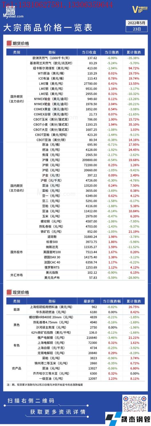 免責聲明:本網站(山東聊城晟杰無縫鋼管廠m.51pvc.cn)刊載的“俄烏局勢丨大宗商品價格一覽表(5月23日)”等均源于網絡,版權歸原作者所有,且僅代表原作者觀點,本文所載信息僅供參考。轉載僅為學習與交流之目的,如無意中侵犯您的合法權益,請及時聯系刪除。本網站刊登此篇文章并不意味著本站贊同其觀點或證實其內容的真實性,我們不對其科學性、嚴肅性等作任何形式的保證。如果侵犯了您的版權,請盡快聯系我們予以撤銷,謝謝合作!