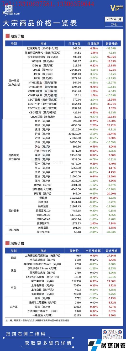 免責聲明:本網站(山東聊城晟杰無縫鋼管廠m.51pvc.cn)刊載的“俄烏局勢丨大宗商品價格一覽表(5月24日)”等均源于網絡,版權歸原作者所有,且僅代表原作者觀點,本文所載信息僅供參考。轉載僅為學習與交流之目的,如無意中侵犯您的合法權益,請及時聯系刪除。本網站刊登此篇文章并不意味著本站贊同其觀點或證實其內容的真實性,我們不對其科學性、嚴肅性等作任何形式的保證。如果侵犯了您的版權,請盡快聯系我們予以撤銷,謝謝合作!
