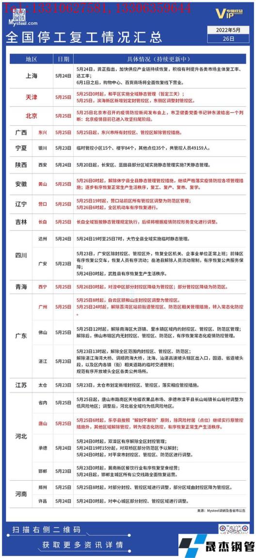 免責聲明:本網站(山東聊城晟杰無縫鋼管廠m.51pvc.cn)刊載的“疫情影響丨全國停工復工情況匯總(5月26日)”等均源于網絡,版權歸原作者所有,且僅代表原作者觀點,本文所載信息僅供參考。轉載僅為學習與交流之目的,如無意中侵犯您的合法權益,請及時聯系刪除。本網站刊登此篇文章并不意味著本站贊同其觀點或證實其內容的真實性,我們不對其科學性、嚴肅性等作任何形式的保證。如果侵犯了您的版權,請盡快聯系我們予以撤銷,謝謝合作!