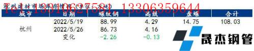 分品種來看,以杭州市場為例,本周杭州市場建筑厚壁無縫鋼管總庫存為102.80萬噸,其中螺紋鋼庫存86.73萬噸,周環比減少2.26萬噸,降幅為2.54%;盤螺11.91萬噸,周環比減少2.84萬噸,降幅為19.25%;線材4.16萬噸,周環比減少0.13萬噸,降幅為3.03%。