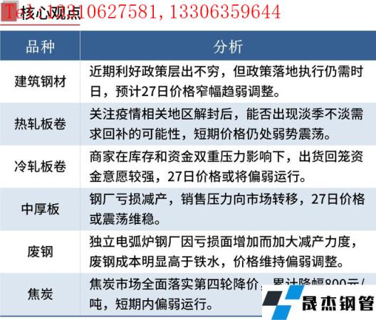 建筑厚壁無縫鋼管:5月26日,全國31個主要城市20mm三級抗震螺紋鋼均價4744元/噸,較上個交易日下跌22元/噸。受現貨持續回落,本周無縫厚壁鋼管廠家減產范圍擴大,螺紋鋼產量小幅下降,廠庫小幅上升,但社庫持續下降,表觀消費小幅回落。短期來看,盡管近期利好政策層出不窮,但政策落地執行仍需時日。目前市場情緒依然偏空,短期仍然需要進一步提振市場消費信心及投資信心。因此預計27日國內建筑厚壁無縫鋼管價格或將繼續窄幅趨弱調整為主。