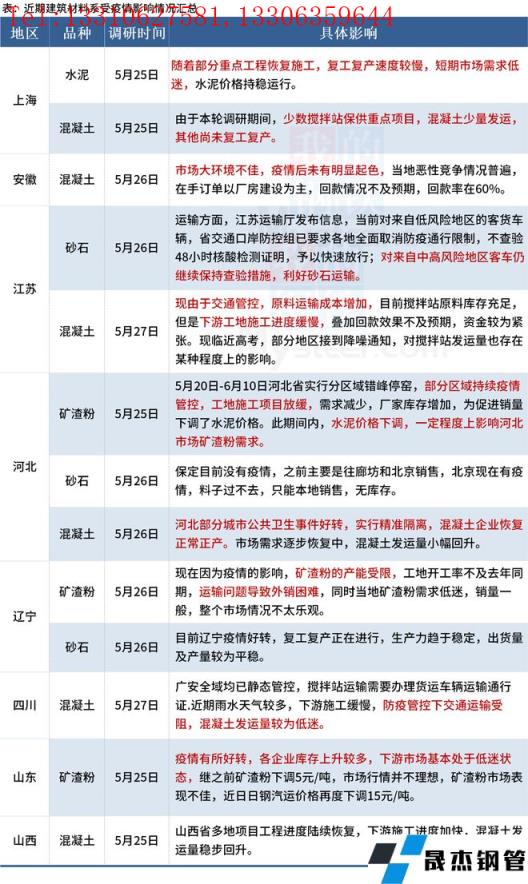 截至5月27日,據(jù)百年建筑網(wǎng)調(diào)研,8個(gè)省份建材市場(chǎng)受到了不同程度的影響。進(jìn)入五月下旬后,施工整體進(jìn)度尚未進(jìn)入“減速”階段,今年整體施工進(jìn)度提升緩慢,市場(chǎng)需求降幅拐點(diǎn)未來(lái)臨。目前疫情防控形勢(shì)繼續(xù)好轉(zhuǎn),建筑材料發(fā)運(yùn)量有一定上升空間。現(xiàn)華東地區(qū)疫情雖得到了一定的控制,但由于交通管控因素,材料運(yùn)輸仍存在一定壓力。具體情況如下: