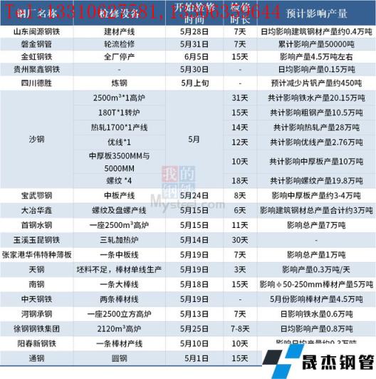 據(jù)不完全統(tǒng)計,5月國內(nèi)18家無縫厚壁鋼管廠家發(fā)布檢修計劃。其中,磐金厚壁鋼管各分廠計劃將于5月31日至6月6日進行輪流檢修,預(yù)計將累計影響產(chǎn)量50000噸。