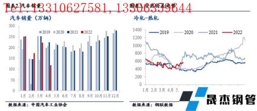 汽車(chē)行業(yè)作為我國(guó)厚壁無(wú)縫鋼管消費(fèi)重要的下游行業(yè),其厚壁無(wú)縫鋼管用量約占汽車(chē)總重量的70%左右。整車(chē)制造過(guò)程中,轎車(chē)單車(chē)厚壁無(wú)縫鋼管耗量1噸左右,其中,冷軋是汽車(chē)厚壁無(wú)縫鋼管消費(fèi)“主力”,約占汽車(chē)厚壁無(wú)縫鋼管消費(fèi)的30%,未來(lái)汽車(chē)需求增量將直接影響冷軋價(jià)格走勢(shì)。一般而言,汽車(chē)產(chǎn)銷旺季在下半年開(kāi)啟,尤其在第四季度達(dá)到頂峰,隨著汽車(chē)消費(fèi)回升,冷熱價(jià)差呈現(xiàn)規(guī)律性擴(kuò)大。2022年以來(lái),受疫情影響,汽車(chē)生產(chǎn)和消費(fèi)受到抑制,尤其是4月份,國(guó)內(nèi)汽車(chē)銷量同比、環(huán)比降幅均超過(guò)40%。本次汽車(chē)購(gòu)置稅減半政策力度大,涉及范圍廣,對(duì)刺激市場(chǎng)消費(fèi)、提振消費(fèi)者信心起到重要作用,預(yù)計(jì)下半年汽車(chē)產(chǎn)銷將得到有力回補(bǔ),7-8月汽車(chē)產(chǎn)銷或呈現(xiàn)“淡季不淡”的特征,冷軋價(jià)格將得到提振,預(yù)計(jì)下半年冷熱價(jià)差或長(zhǎng)期居于高位。