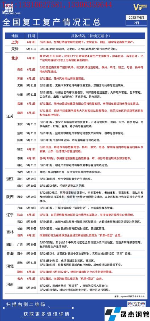免責聲明:本網站(山東聊城晟杰無縫鋼管廠m.51pvc.cn)刊載的“疫情影響丨全國復工復產情況匯總(6月2日)”等均源于網絡,版權歸原作者所有,且僅代表原作者觀點,本文所載信息僅供參考。轉載僅為學習與交流之目的,如無意中侵犯您的合法權益,請及時聯系刪除。本網站刊登此篇文章并不意味著本站贊同其觀點或證實其內容的真實性,我們不對其科學性、嚴肅性等作任何形式的保證。如果侵犯了您的版權,請盡快聯系我們予以撤銷,謝謝合作!