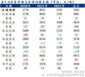 據(jù)鋼聯(lián)數(shù)據(jù)對各區(qū)域主流市場及全國均價(jià)的5月價(jià)差數(shù)據(jù)分析:山東、東北今年價(jià)格較全國平均水平有所抬升,華北、華南、華東、華中較全國平均水平有所下降;