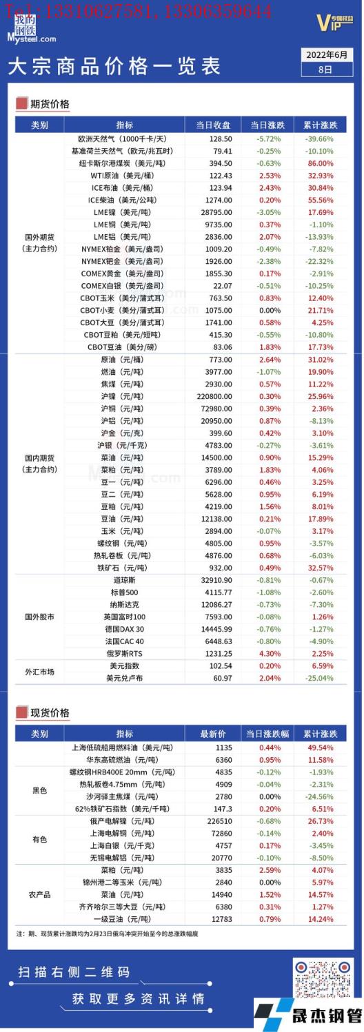 免責聲明:本網站(山東聊城晟杰無縫鋼管廠m.51pvc.cn)刊載的“俄烏局勢丨大宗商品價格一覽表(6月8日)”等均源于網絡,版權歸原作者所有,且僅代表原作者觀點,本文所載信息僅供參考。轉載僅為學習與交流之目的,如無意中侵犯您的合法權益,請及時聯系刪除。本網站刊登此篇文章并不意味著本站贊同其觀點或證實其內容的真實性,我們不對其科學性、嚴肅性等作任何形式的保證。如果侵犯了您的版權,請盡快聯系我們予以撤銷,謝謝合作!