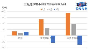 5月份由于成本表現分化,市場均值震蕩下行,使得5月份品種噸鋼毛利相比上月有明顯差異。以三級螺紋鋼為例,以即期原料成本測算5月份毛利空間較上月上升25元/噸,以兩周、四周原料庫存周期測算5月份毛利空間均進入虧損負值區間,兩周原料庫存周期測算毛利較上月減少239元/噸,以四周原料庫存周期測算5月份毛利空間較上月減少347元/噸(詳見圖2)。