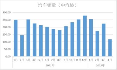 根據中國汽車工業協會統計數據顯示,2022年4月份,汽車產銷分別完成120.5萬輛和118.1萬輛,環比分別下降46.2%和47.1%,同比分別下降46.1%和47.6%。1-4月,汽車產銷分別完成769.0萬輛和769.1萬輛,同比分別下降10.5%和12.1%。